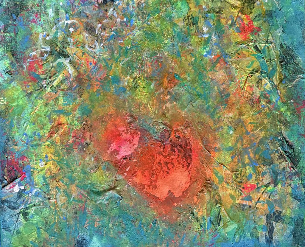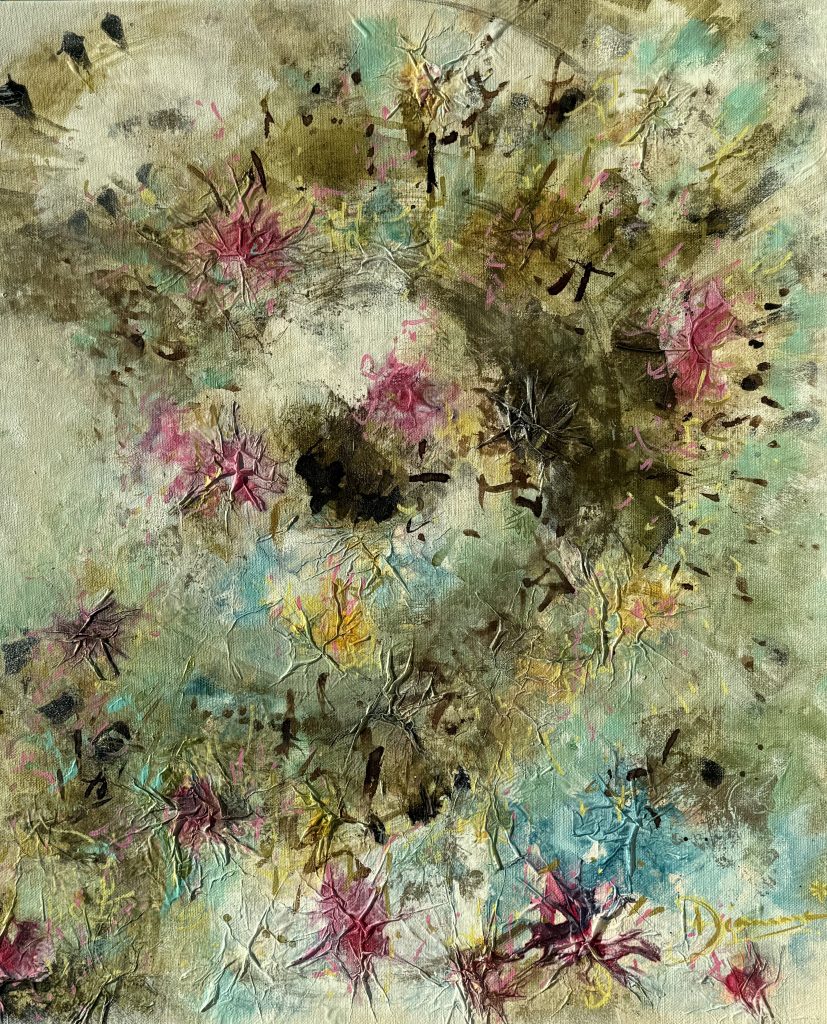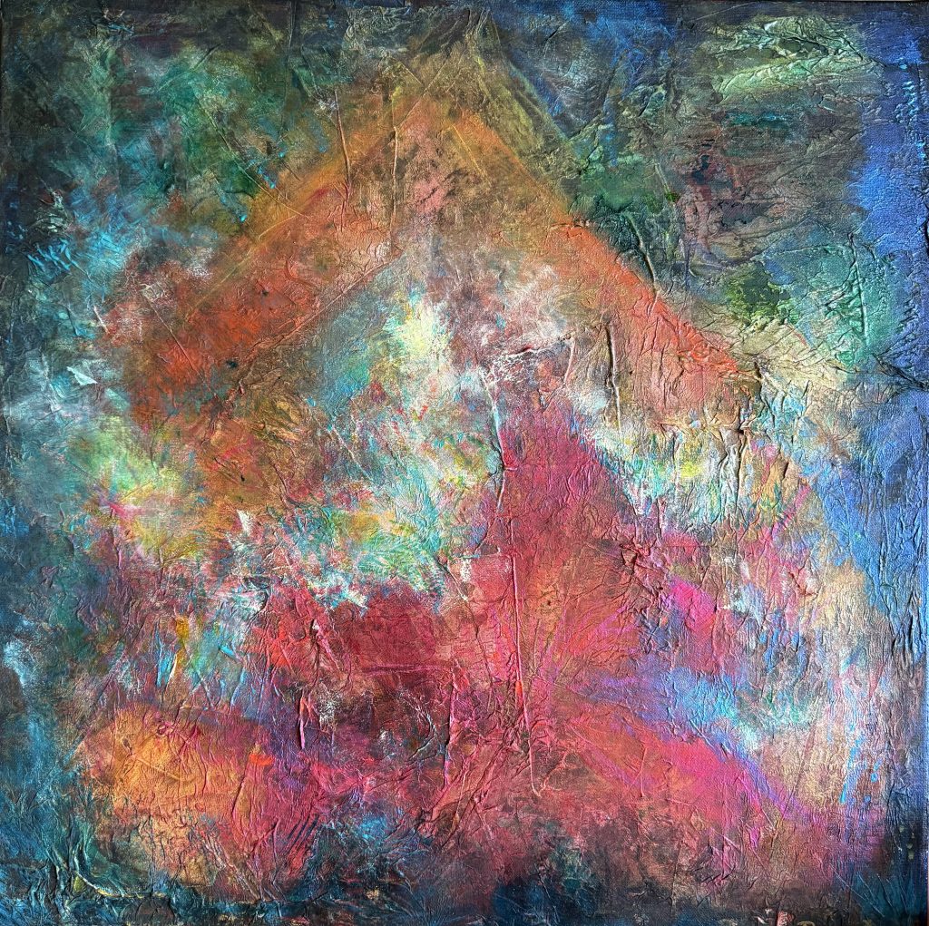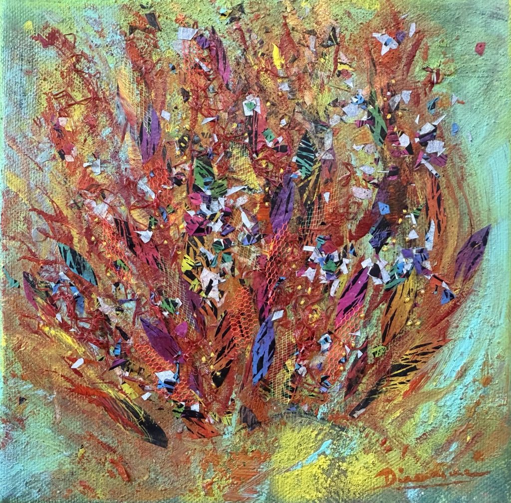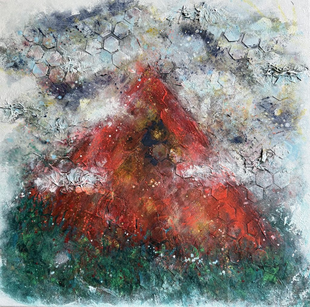 Quatre créations 2024, de 100x100cm. Techniques mixtes : collage, sable, broderie